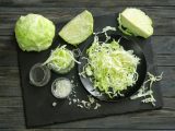 • Discard the soft outer leaves of the cabbage and thinly slice with a slicer or using a sharp knife. Discard or save the remaining core. Transfer the shredded cabbage to a large mixing bowl.