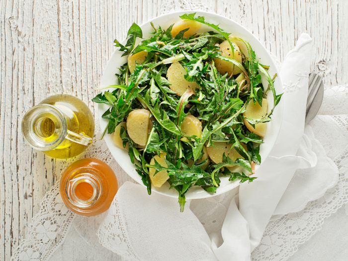 First, assemble the salad in a large bowl. Start by laying the cleaned dandelion greens. You can cut the leaves into 2-inch length for a better presentation.